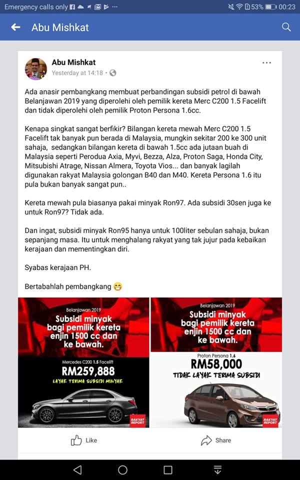 1) betul, Merc W205 x semua org pakai. BMW i8 pun x ramai org pakai, tapi ramai je yg pakai Honda City Modulo 1.5 atau Toyota Vios TRD 1.5 (rega RM93k lebih) esp eksekutif muda. Manakala pakcik² yg bersara ramai je yg guna Waja atau Gen2 lama berenjin 1.6 liter. So adakah eksekutif muda yg bergaya dgn Honda City baru layak dapat subsidi minyak berbanding sorg pakcik pesara kerj biasa² yg pakai Gen2 buruk stok bumper dah nak tercabut?