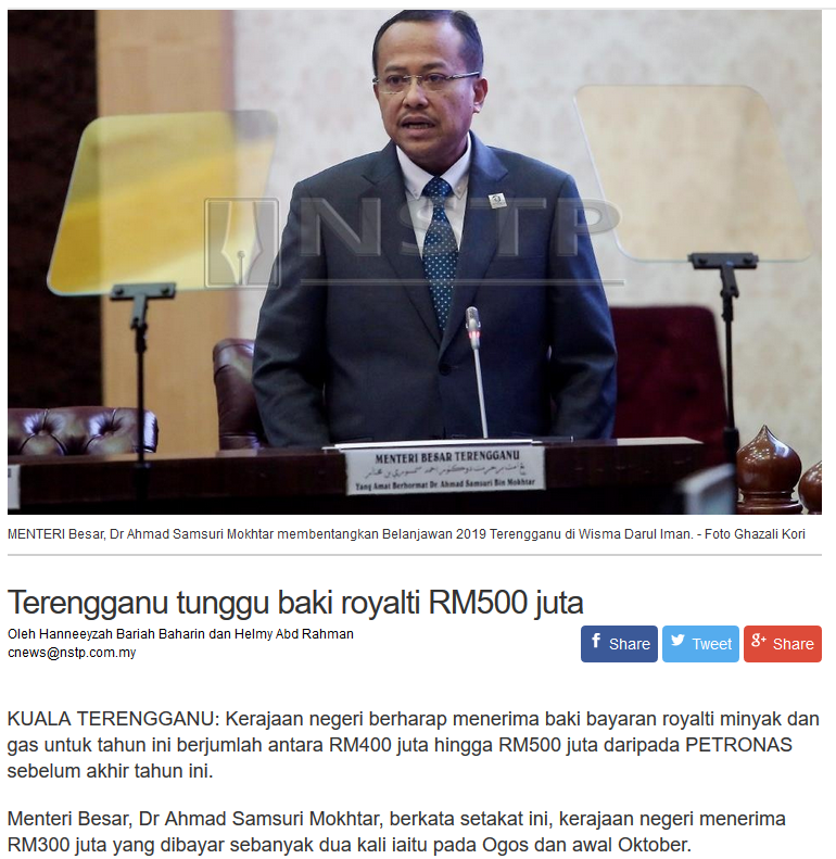 Namun begitu ketika bercakap kepada TV3 pada 25 November, MB Terengganu Dr Ahmad Samsuri Mokhtar berkata negeri itu telah menerima RM300 juta royalti sejak Ogos tahun ini.