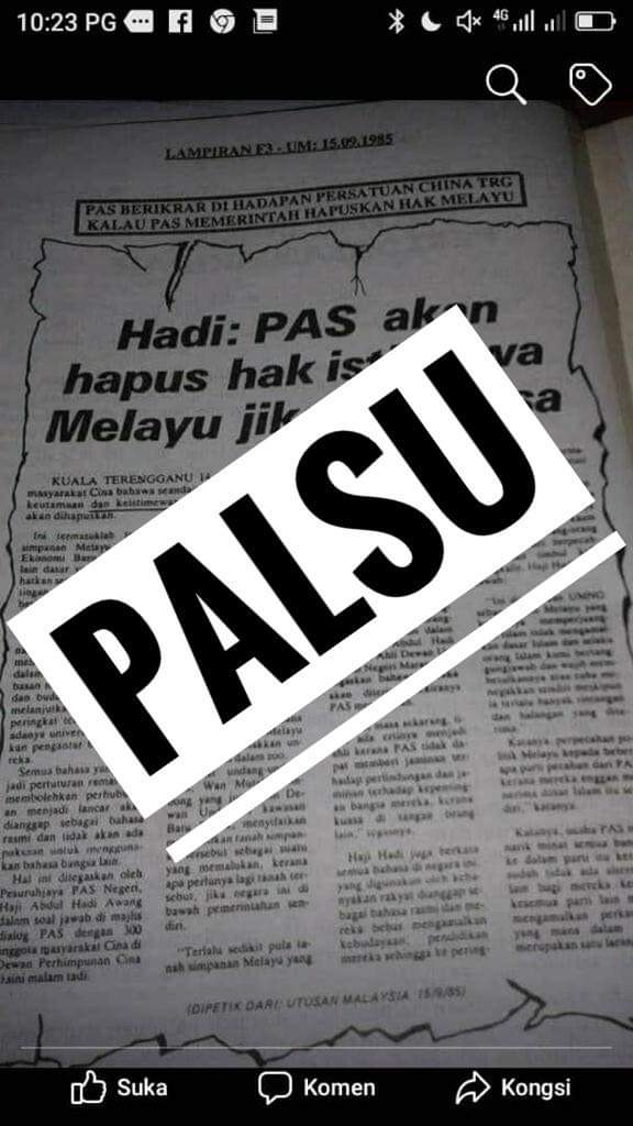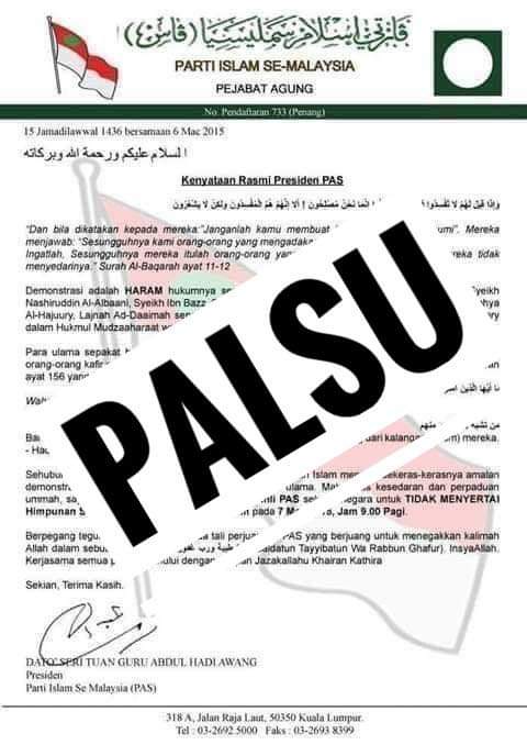 Pihak kami tidak pernah mengeluarkan kenyataan media berserta tandatangan Presiden PAS (rujuk kenyataan media palsu bertarikh 6 Mac 2015), dan difahamkan keratan akhbar bertarikh 15 September 1985 telah disalah lapor dan dikitarsemula oleh pihak tertentu ketika isu ICERD dibahaskan.