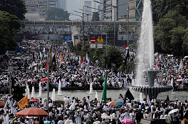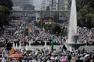 JAKARTA - Kira-kira 100,000 ribu orang Islam menyertai perhimpunan di sekitar Monumen Nasional (Tugu Monas) di Jakarta semalam, membayangkan peningkatan pengaruh kumpulan Islam menjelang pilihan raya Presiden Indonesia pada tahun depan.