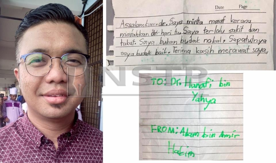 TAPAH: Seorang doktor terharu menerima surat permohonan maaf daripada seorang budak yang memarahinya ketika dikhatankan di kliniknya di Tapah Road di sini.