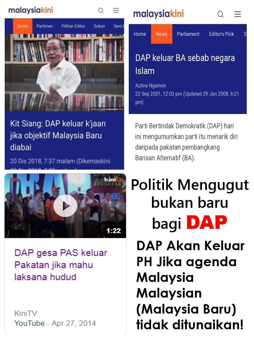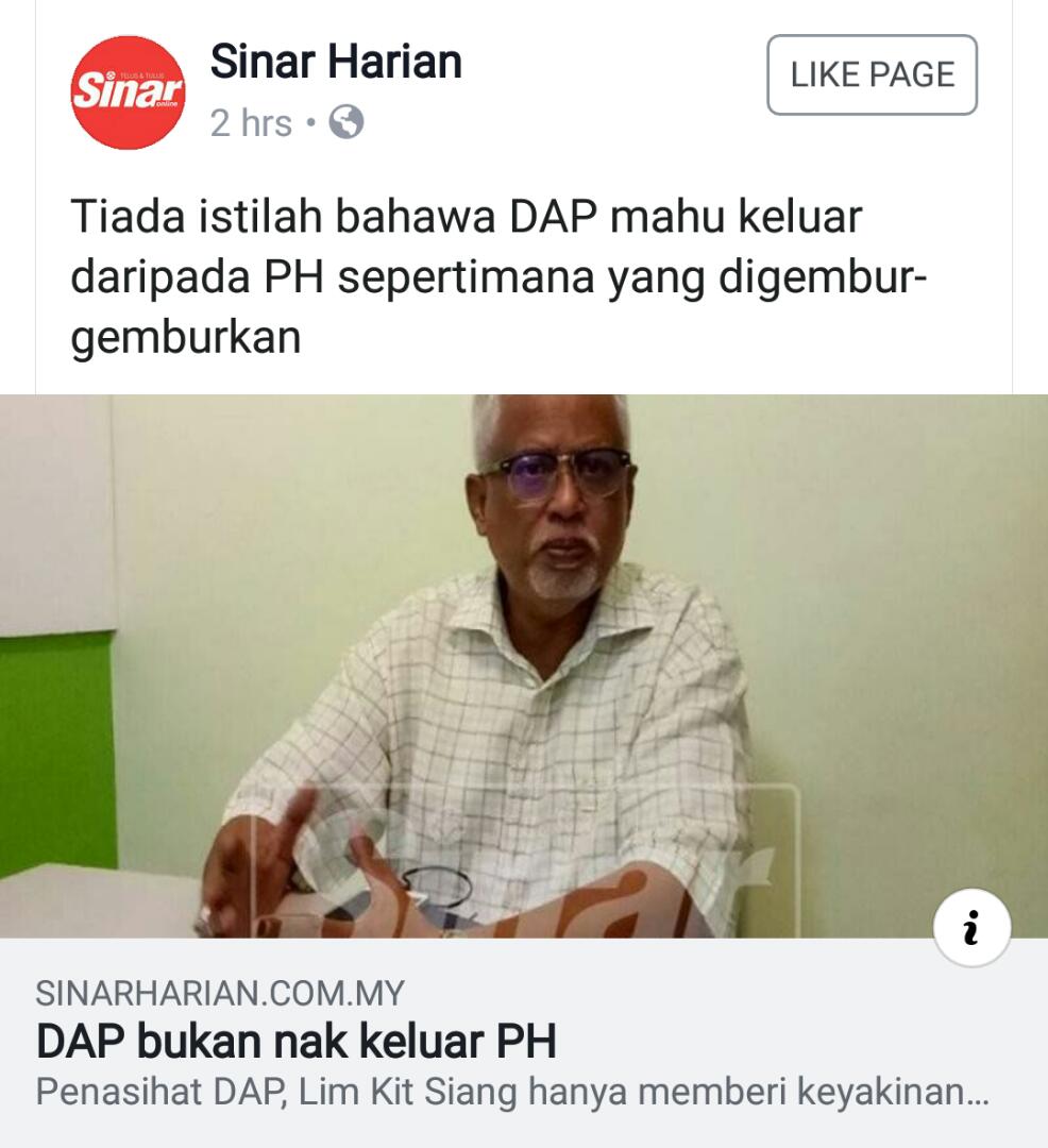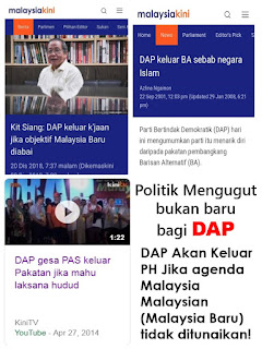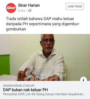 Ahli Parlimen Iskandar Puteri, Lim Kit Siang memberikan amaran bahawa DAP tidak teragak-agak untuk keluar daripada kerajaan PH jika objektif Malaysia Baru tidak tercapai. Pada saya, ia hanyalah gertak sahaja yang mustahil sama sekali dilakukan oleh DAP.