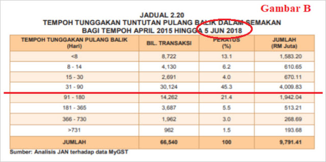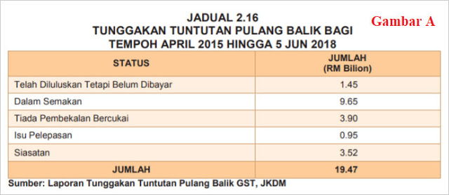 Laporan Audit menunjukkan bahawa jumlah wang input GST yang belum dibayar balik setakat 5 Jun 2018 sebenarnya ialah RM19.47 bilion (Gambar A).