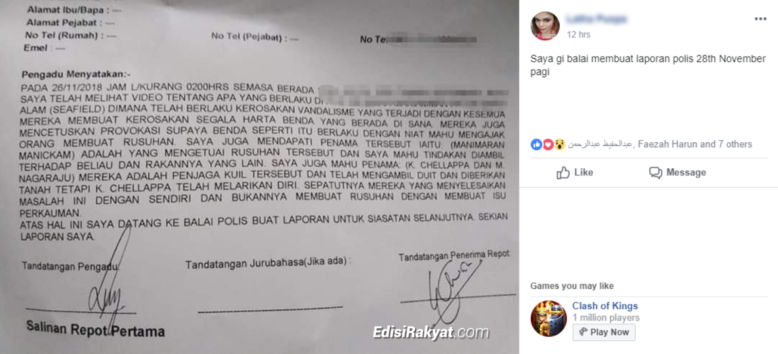 SEORANG wanita tampil mendedahkan laporan polis yang telah dibuatnya pada 28 November 2018, berhubung rusuhan yang berlaku di Kuil Sri Maha Mariamman, Seafield.