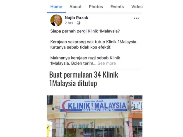 KUALA LUMPUR - Bekas Perdana Menteri, Datuk Seri Najib Tun Razak membidas keputusan kerajaan mahu menutup beberapa Klinik 1Malaysia, mendakwa klinik berkenaan berdepan dengan masalah kos tidak efektif.