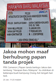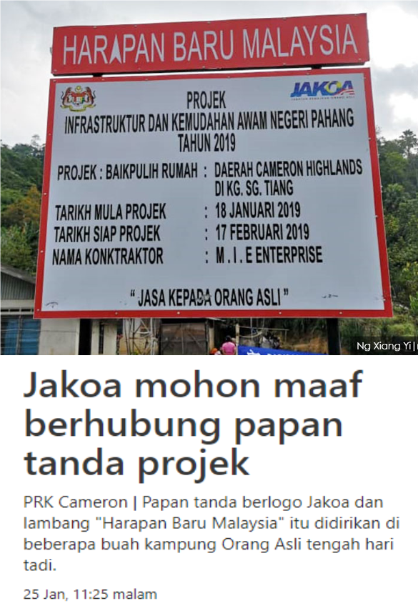 "JAKOA ingin menjelaskan bahawa papan tanda projek tersebut merupakan satu kesilapan yang tidak disengajakan.