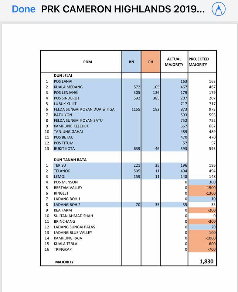 Berdasarkan maklumat-maklumat terkini yang diterima, saya unjurkan yang calon Barisan Nasional akan menang dengan majoriti di antara 1,000 ke 3,000 undi di PRK Cameron Highlands kali ini, lebih besar daripada majoriti 597 yang diperoleh pada PRU-14 yang lepas.