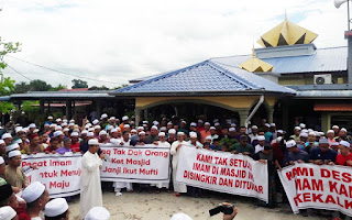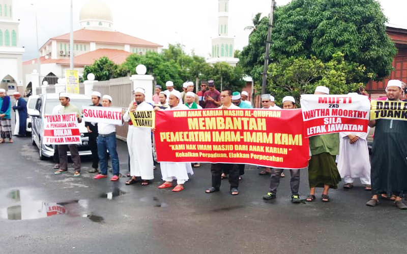 Mereka membawa kain rentang tertera “tukar mufti bukan tukar imam” sambil melaungkan bantahan terhadap pemecatan itu.