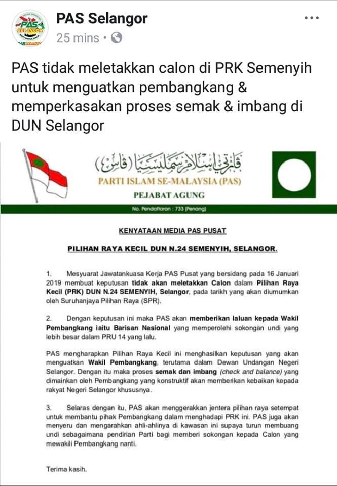 PAS memutuskan untuk memberi laluan kepada Barisan Nasional (BN) untuk bertanding dalam Pilihan Raya Kecil (PRK) Dewan Undangan Negeri (DUN) Semenyih, pada tarikh yang akan diumumkan Suruhanjaya Pilihan Raya (SPR) kelak.