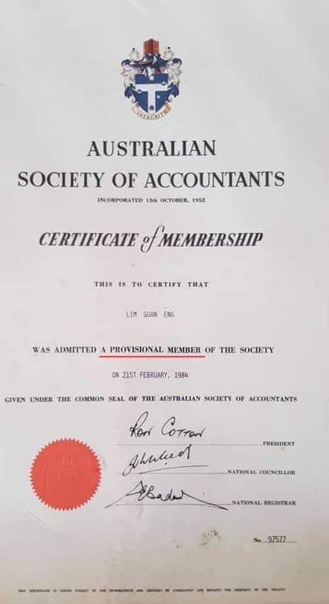 I also take note of the document furnished by Tony Pua today which shows Lim Guan Eng's membership into the Australian Society of Accountants.