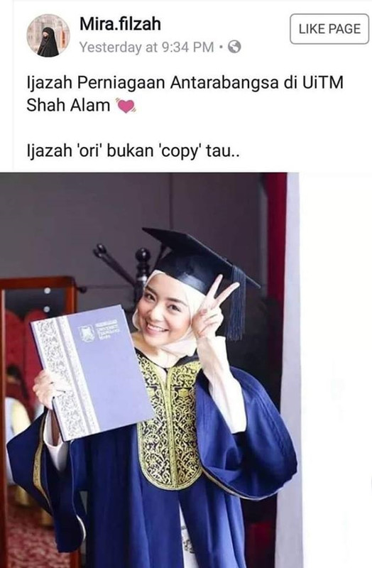 Semalam, Mira Filzah telah memuat naik gambar beliau berpakaian konvo bersama-sama sekeping ijazah berserta status “Ijazah Perniagaan Antarabangsa di UiTM Shah Alam. Ijazah ‘ori’ bukan ‘copy’ tau..” di Facebook miliknya.