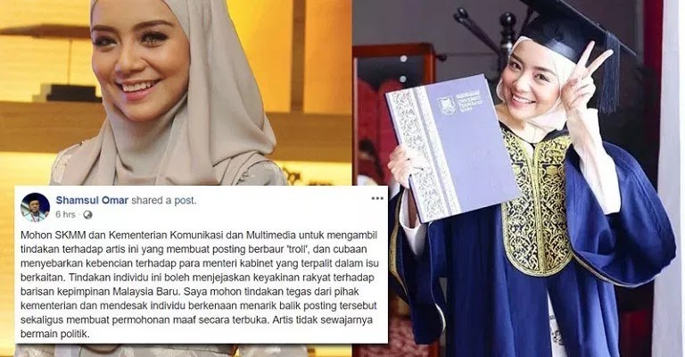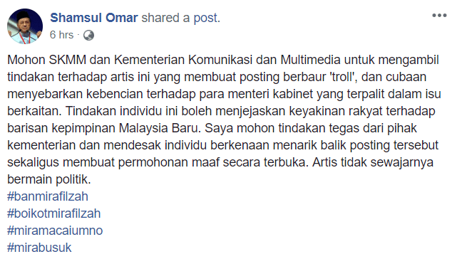 Shamsul mahu Mira Milzah menarik balik posting berkenaan dan memohon maaf secara terbuka di atas tindakannya.