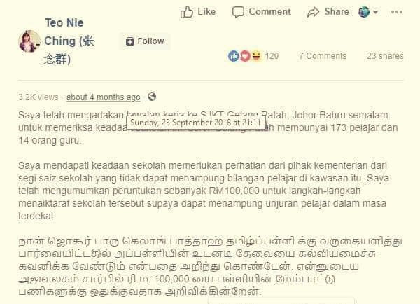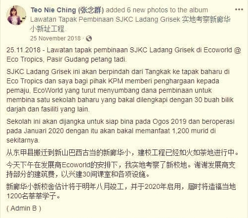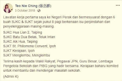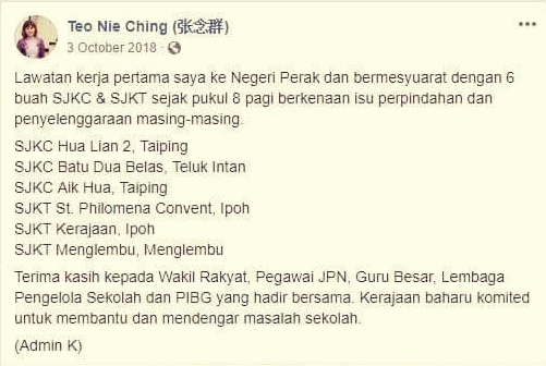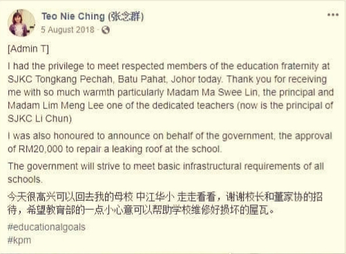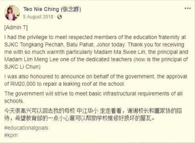 Melihat sekali imbas aktiviti Timbalan Menteri Pendidikan, Teo Nie Ching (DAP), kita akan dapati hampir setiap bulan pengumuman peruntukan di berikan kepada Sekolah Jenis Kebangsaan Cina atau India...