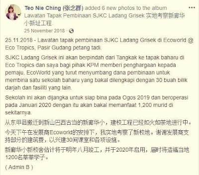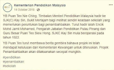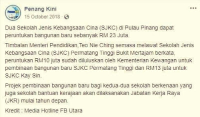 Mengumumkan kelulusan RM 23 juta untuk SJK(Cina) Permatang Tinggi dan SJK(Cina) Kay Cin dari Kementerian Kewangan...