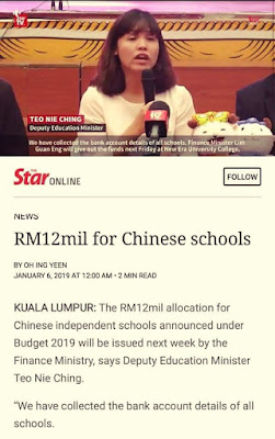 Bukan setakat itu, mereka memerlukan cuma 8 bulan untuk mengumumkan bantuan sebanyak RM 12 juta kepada Sekolah Persendirian Cina yang jelas di dalam Perlembagaan BUKAN di bawah tanggungjawab kerajaan...