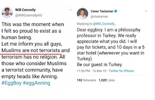 “Kepada eggboy. Saya adalah seorang profesor di Turki. Kami sangat menghargai apa yang anda lakukan. Saya akan membayar tiket (penerbangan), dan 10 hari tinggal di hotel lima bintang (di mana sahaja yang anda mahu). Jadilah tetamu kami di Turki,” tulis Profesor Caner Taslaman di akaun Twitternya.