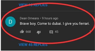 Seorang pengguna lain, Dean Omeara pula menawarkan sebuah Ferrari jika dia datang ke Dubai.