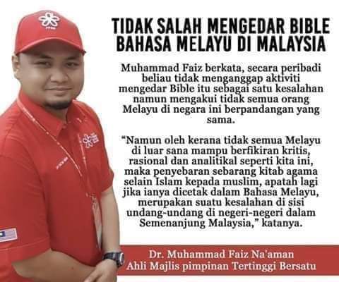 “Namun oleh kerana tidak semua Melayu di luar sana mampu berfikiran kritis, rasional dan analitikal seperti kita ini, maka penyebaran sebarang kitab agama selain Islam kepada muslim, apatah lagi jika ianya dicetak dalam Bahasa Melayu, merupakan suatu kesalahan di sisi undang-undang di negeri-negeri dalam Semenanjung Malaysia,” katanya.