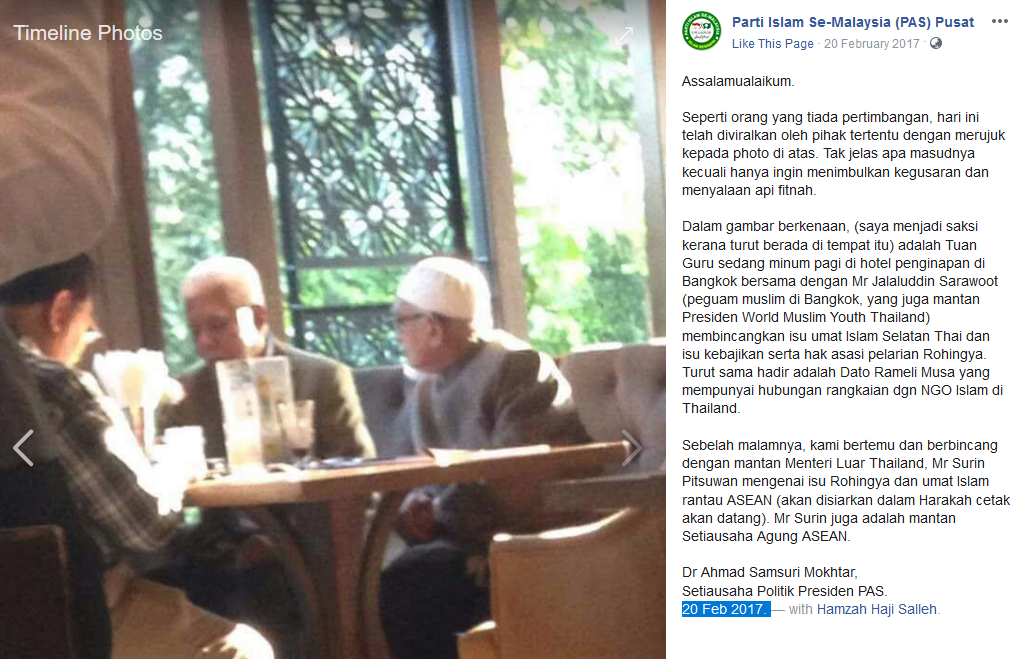 Mereka palsukan gambar Tuan Guru Presiden PAS sedang minum pagi di hotel penginapan di Bangkok bersama dengan Mr Jalaluddin Sarawoot (peguam muslim di Bangkok, yang juga mantan Presiden World Muslim Youth Thailand) membincangkan isu umat Islam Selatan Thai dan isu kebajikan serta hak asasi pelarian Rohingya 20 Feb 2017.INI JAHATNYA ANWAR DAN RAFIZI SERTA PH TERMASUK IKRAM YANG JADI PENGIKUT KUAT AMANAH.