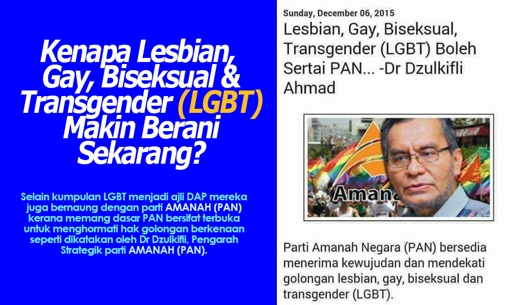 Pengarah Strategi PAN, Dr. Zulkifli Ahmad yang diamanahkan untuk mendapatkan sokongan dalam usaha meningkat keahlian PAN telah mengeluarkan satu kenyataan sangat silap dalam pejuangan Islam iaitu memberikan ruang kepada golongan LGBT bersama parti AMANAH (PAN). (Sila ruju di sini atau di sini). Semenjak 2015 lagi AMANAH (PAN) telah menanam benih LGBT... hasilnya sekarang.