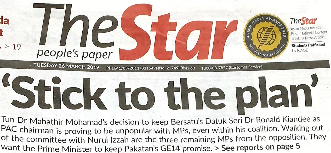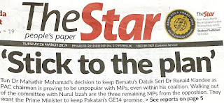 "Stick to the plan" atau "Ikut rancangan yang telah diputuskan" demikian tajuk utama akhbar The Star hari ini.