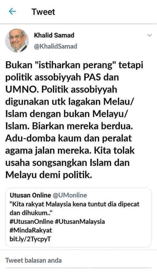 dalam masa yang sama Kahlid Samad juga dilihat pertahankan Lim guan eng di status twitternya dengan mengeluarkan kenyataan seperti dibawah