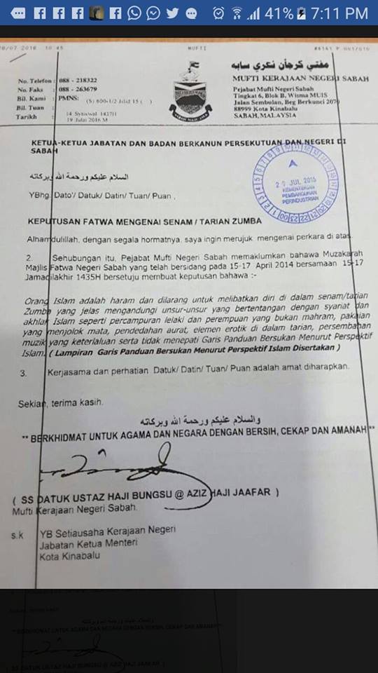 Mufti Sabah pada tahun 2014 telah mengeluarkan surat pengharaman tarian ini. Kemudian keluarkan lagi pada tahun lalu apabila ada yang masih orang Islam "bangang' mengajurkannya lagi. Dalam kenyataannya "Mufti Sabah kembali mengingatkan umat Islam bahawa aktiviti tarian dan senamrobik yang diiringi muzik rancak iaitu senaman zumba adalah haram."Tapi bagi parti AMANAH haram-haramlah asalkan dapat undi Cina.