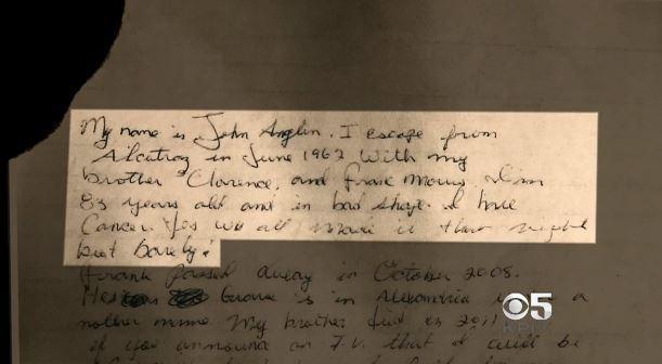 "Nama saya ialah John Anglin, saya telah melarikan diri dari Alcatraz pada Jun 1962 dengan saudara saya Clarence dan Frank Morris. Saya berusia 83 tahun dan dalam keadaan tak sihat. Saya menghidap barah. Ya, kami semua melarikan diri pada malam itu, tapi hampir-hampir tak berjaya!,".