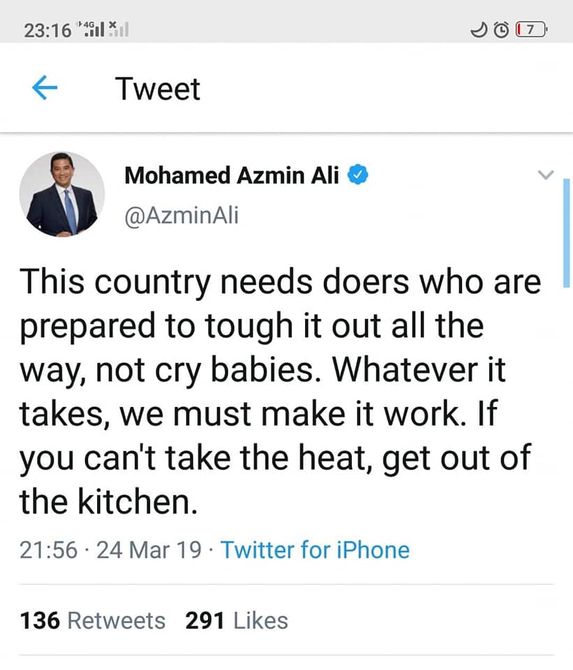 Seorang bekas ahli parlimen PKR N.Surendran menyelar tindakan Nurul menyerang Tun sebagaimana dilaporkan The Star hari ini manakala Timbalan Presiden PKR DS Azmin Ali dilihat memerli tindakan Nurul itu dalam tweet nya walau tidak menyebut nama (cry baby?).