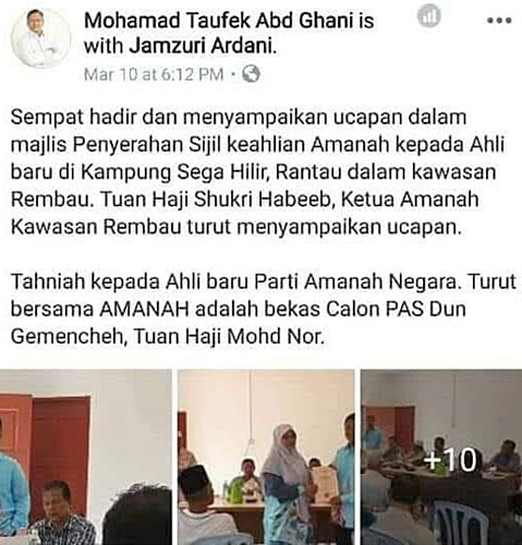 Netizen membongkar Nor menyertai Amanah pada 10 Mac yang lalu melalui satu coretan Facebook milik Timbalan Pengerusi Amanah Negeri Sembilan, Mohamad Taufek Abdul Ghani di bawah. Gambar Nor menerima sijil keahlian Amanah juga terpapar dengan jelas.