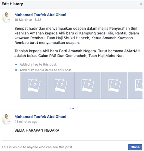 Ketika gambar tersebut tular, tiba-tiba status Facebook bertarikh 10 Mac milik Taufek diubah kepada “Belia Harapan Negara” 44 minit sebelum semakan dibuat pada 5.27 petang semalam.