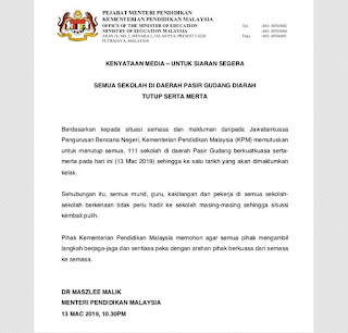 ASIR GUDANG: Kesemua 111 buah sekolah di daerah Pasir Gudang telah diarah ditutup serta-merta, susulan kes pencemaran sisa kimia di Sungai Kim Kim yang kini berada pada tahap yang semakin kritikal.