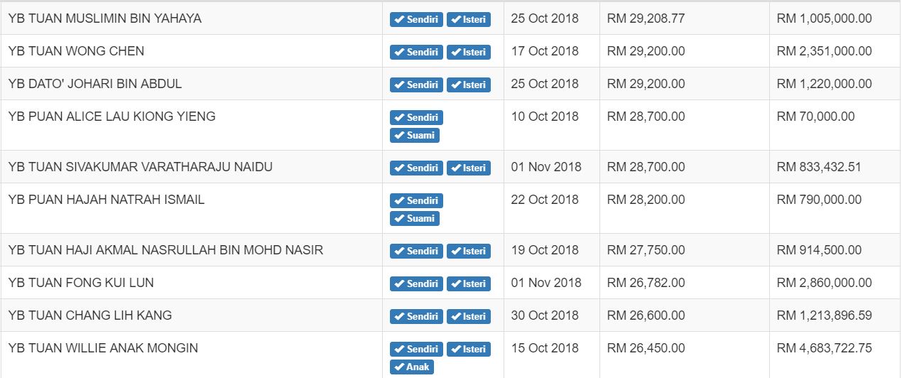 Putrajaya , 4 Mac: Baru-baru ini Suruhanjaya Pencegah Rasuah Malaysia melalui portal pengisytiharan harta di https://mydeclaration.sprm.gov.my/ telah mengemaskini data mengenai pendapatan bulanan dan aset ahli parlimen, senator dan setiausaha politik kerajaan. Setakat ini portal tersebut telah menyenaraikan pendapatan dan aset seramai 145 orang.