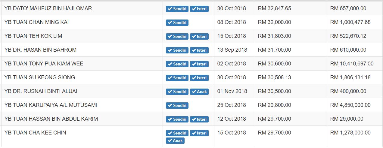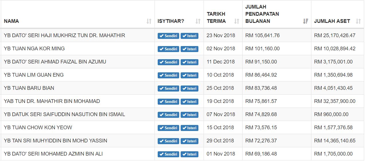 TTKM mendapati pendapatan bulanan paling tinggi kini dijuarai oleh anak perdana menteri, merangkap menteri besar Kedah, YB Dato’ Seri Muhkriz Mahathir yang juga timbalan presiden PPBM dengan pendapatan bulanan berjumlah RM 105 641.76.