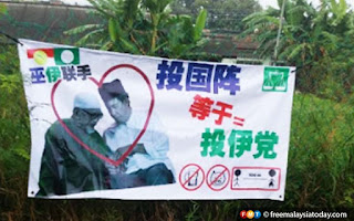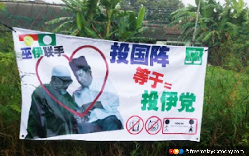 Kain rentang itu ditulis dalam bahasa Cina “undi BN sama dengan undi PAS” berserta gambar Presiden PAS, Abdul Hadi Awang dan Mohamad dalam lakaran berbentuk hati serta lukisan gelas dan babi dengan tanda larangan.