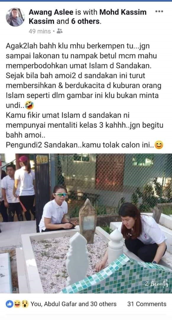 "Sejak bila bah amoi-amoi (wanita) di Sandakan ini turut membersihkan dan berdukacita di kuburan orang Islam seperti dalam gambar ini kalau bukan mahu minta undi,"