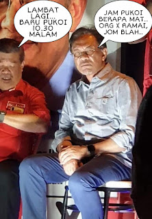 Dua bos parti satu daripada PKR satu lagi daripada AMANAH parti pengkhianat Islam. Dua-dua pun daripada Menteri yang hebat, satu Menteri Pertahanan dan satu Lagi "Menteri Tunggu Jawapan PM". Tapi yang hadir tak sampai 50 orang. Jika kita buat analisis lebih detail kita akan dapati daripada 50 orang nescaya lebih separuh adalah jentera PH....