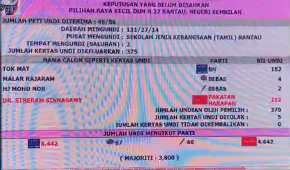 Setakat ini hanya 10 peti undi belum dikira sempurna. iaitu baru 46/56 peti undi telah dikira tapi keputusan masih belum rasmi kerana mungkin ada bantahan untuk kiraan semula.