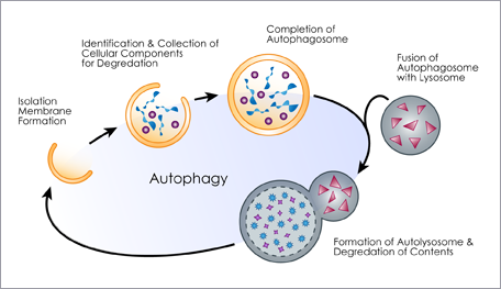 Namun, jika kereta anda rosak, anda tidak lah perlu membeli kereta baharu serta-merta sebaliknya hanya menukarkan bahagian yang rosak, sebagai contoh bateri. Ia juga sama kepada sel-sel ini. Daripada membunuh kesemua sel (proses apoptosis), badan kita hanya perlu membunuh sel-sel yang lama dan rosak sahaja. Inilah yang dinamakan proses autophagy, di mana organel sub-selular dimusnahkan dan yang baru dibina semula untuk menggantikannya.