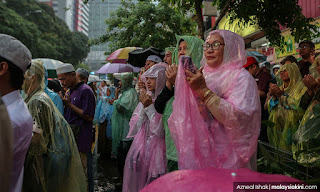 Kelihatan peserta mula beralih ketepi jalan untuk berteduh namun ada antara mereka yang tetap tidak berganjak dengan membuka payung dan memakai baju hujan.