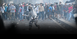 Rangkaian stesen televisyen Indonesia menunjukkan penunjuk perasaan membaling batu, ketika berdepan ratusan polis pencegah rusuhan di Jakarta Pusat.