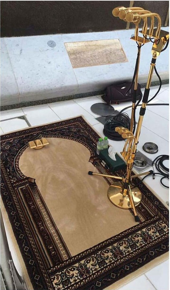 Beginilah sajadah, pengeras suara dan peralatan lainnya (tissue dan air minun) yg diletakkan di depan Ka'bah khusus bagi imam di Masjidil Haram. Posisi imam berada di depan pintu Ka'bah.