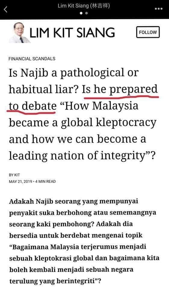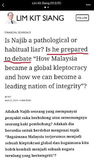 Bila Dato Seri Najib ajak berdebat, Kit Siang pula yang sarankan tajuk “Bagaimana Malaysia menjadi sebuah negara kleptokrasi dan bagaimana kita menjadi negara berintegriti.