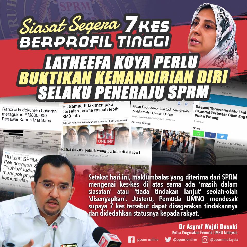 3. Justeru, bagi memberi peluang kepada Puan Latheefa Koya membuktikan kesungguhan dan mengotakan janji beliau untuk membersihkan Malaysia daripada rasuah, Pemuda UMNO menyarankan agar beliau haruslah 'without fear or favour' mempercepatkan dan membuka kembali kertas siasatan 7 kes berprofil tinggi melibatkan rakan-rakan pimpinan PH beliau yang 'disenyapkan'. Ini termasuklah: