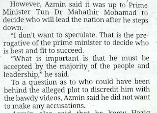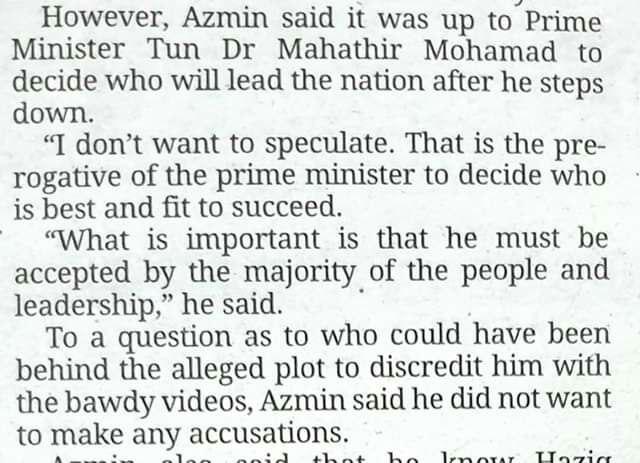 Tambah Azmin beliau tidak mahu buat spekulasi tapi ianya prerogatif PM untuk putuskan siapakah yang terbaik dan paling layak. Yang penting katanya lagi yang dipilih itu mestilah seorang yang diterima rakyat dan pimpinan.