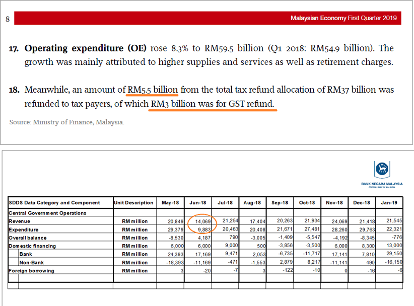 Tetapi laporan Perbendaharaan Negara dari Menteri Kewangan minggu lepas menunjukkan bahawa hanya RM2.5 bilion telah untuk tuntutan cukai pendapatan dan RM3 bilion untuk input GST sahaja telah dibayar balik di dalam tempoh suku pertama tahun 2019.