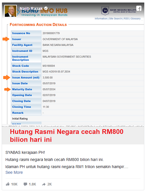 Najib turut berkongsi maklumat pengeluaran bon berjumlah RM3.5 bllion yang akan bermula esok dan mencapai tempoh matang pada 2034.