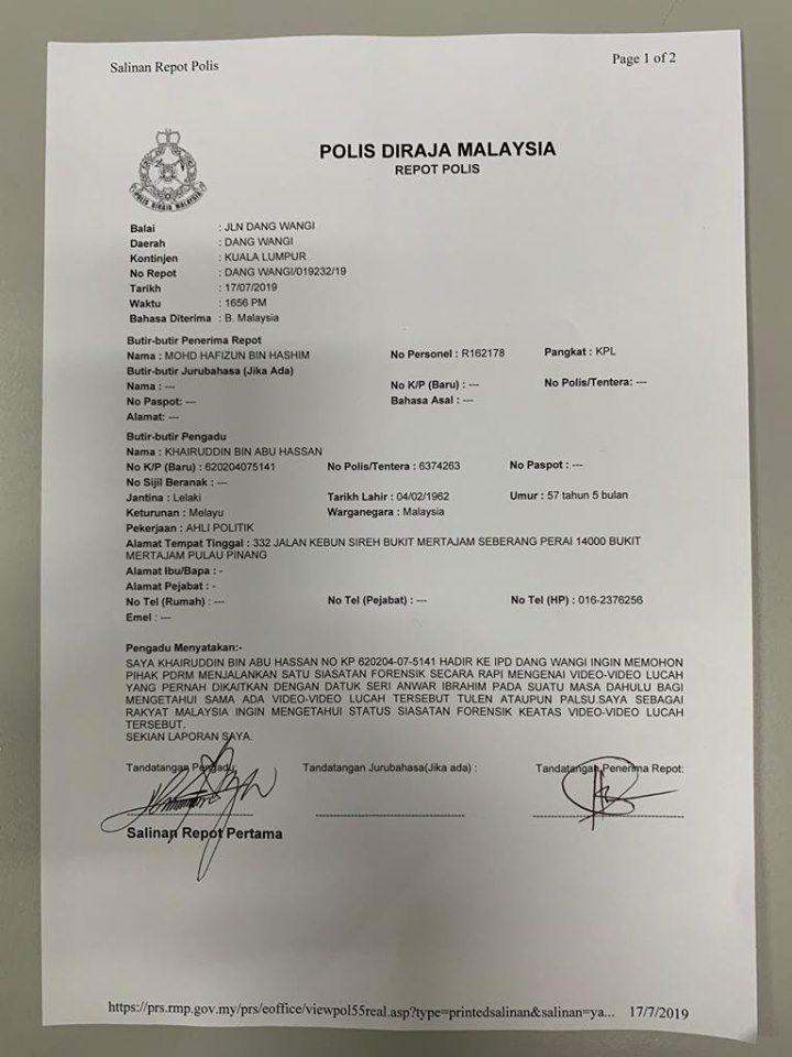 "Atas dasar untuk mengelak fitnah dari terus melanda bakal perdana menteri kelapan (merujuk Anwar) sebab itulah saya membuat laporan polis memohon siasatan forensik ke atas semua video-video yang pernah mengaitkan Anwar bagi mengetahui sama ada video-video ini tulen ataupun palsu," kata Khairuddin dalam kenyataan media memaklumkan laporan polis itu.
