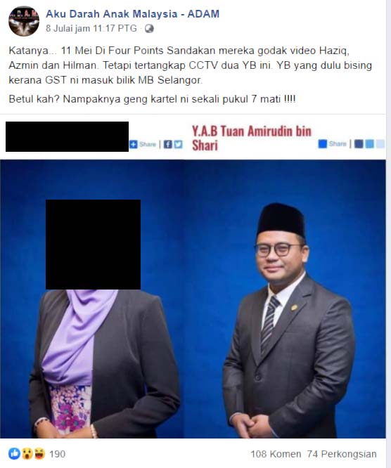 “Katanya… 11 Mei Di Four Points Sandakan mereka godak video Haziq, Azmin dan Hilman. Tetapi tertangkap CCTV dua YB ini. YB yang dulu bising kerana GST ni masuk bilik MB Selangor. Betul kah? Nampaknya geng kartel ni sekali pukul 7 mati !!!!” - Laman FB Aku Darah Anak Malaysia.