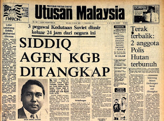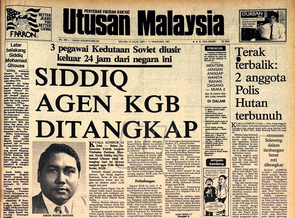 Pada hari ini 13.7.1981, Kerajaan Malaysia telah mengusir keluar tiga orang pegawai Kedutaan Soviet dari negara ini kerana kesalahan pengintipan. Turut sama ditangkap ialah Encik Siddiq Mohamad Ghouse. Beliau telah ditangkap di bawah akta keselamatan Dalam Negeri (I.S.A.) kerana menjadi agen Polis Rahsia Soviet iaitu KGB dan kegiatannya itu memudaratkan keselamatan negara.